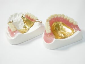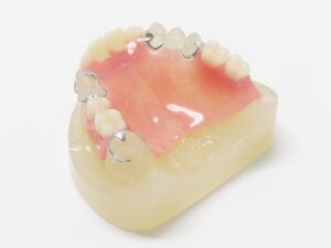金属床義歯: 床の部分にコバルトクロム合金やチタンなどの金属を使用します。