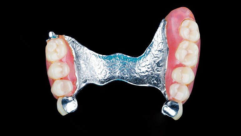金属で補強することで、たわみが減り、より安定して噛むことができます。金属を利用することで薄く作れるので違和感も少なく、熱も伝わるので食事を美味しく感じるというメリットもあります。
